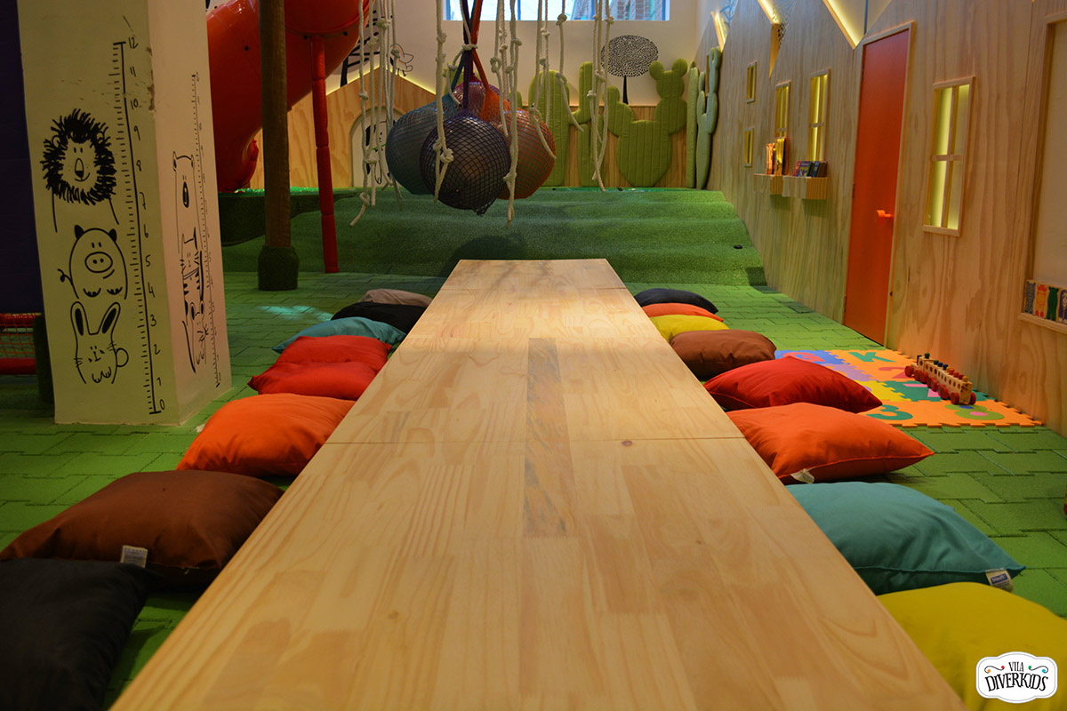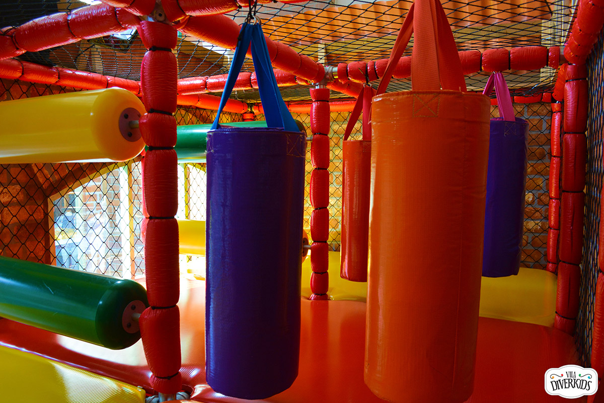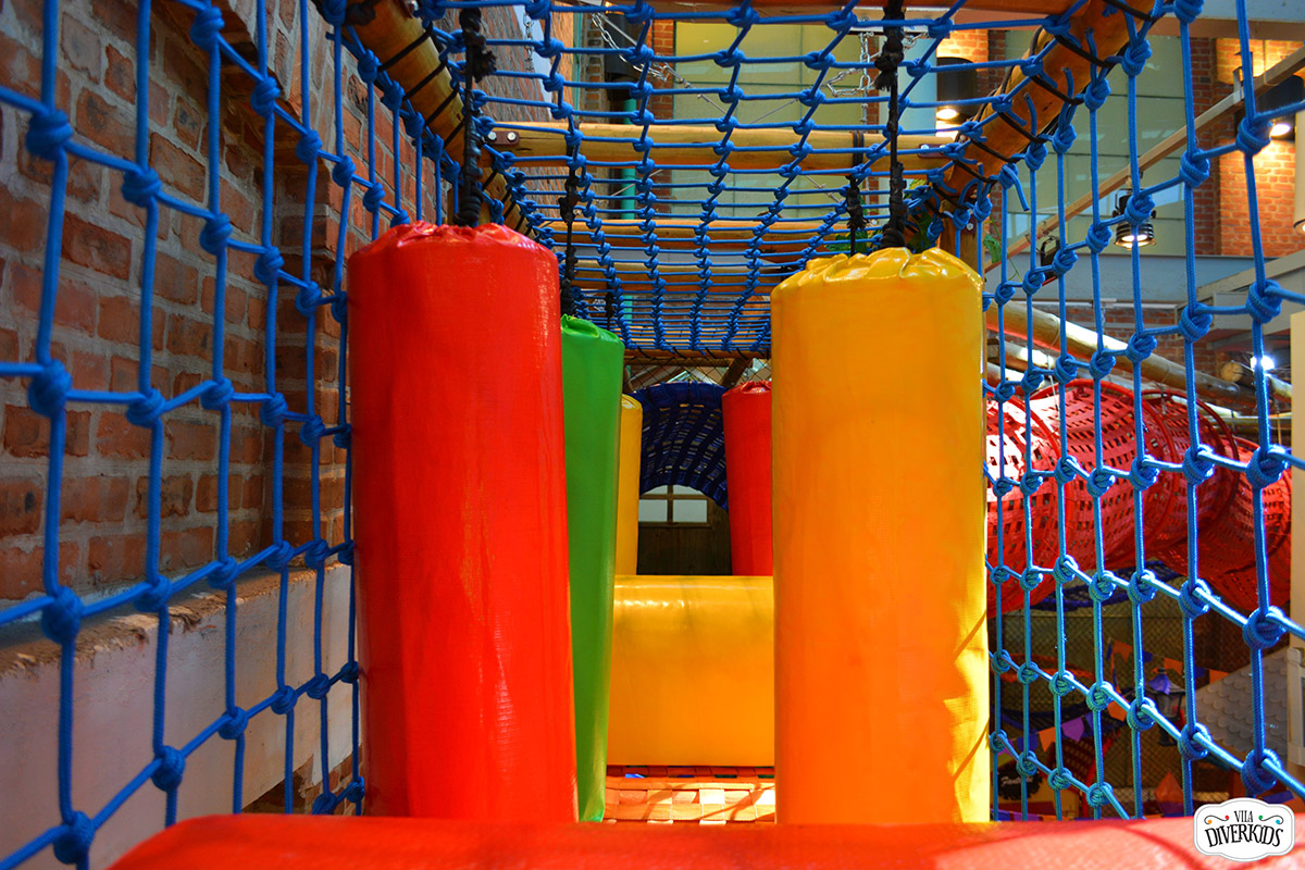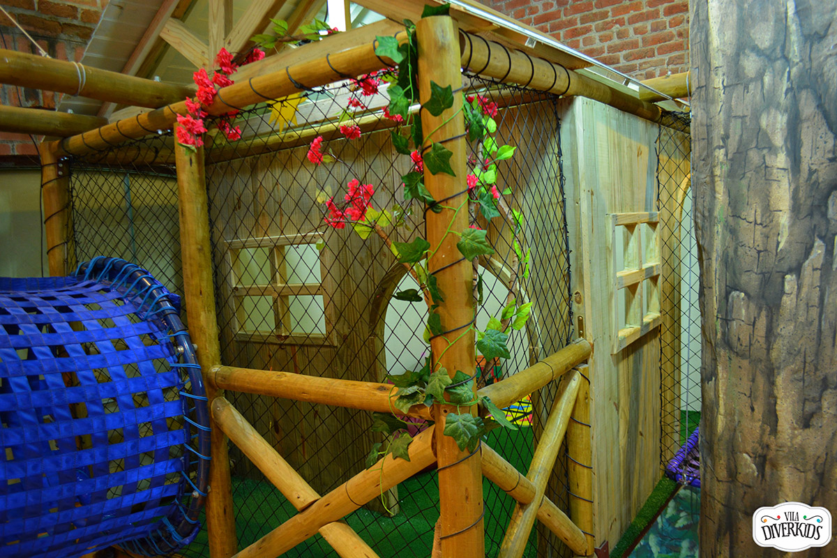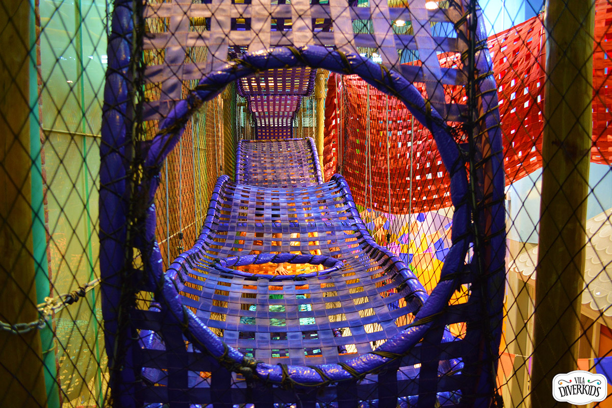 A Vila Diverkids possui um circuito aéreo sinuoso que leva as crianças até uma casa de árvores, caindo em uma mini-piscina de bolinhas.